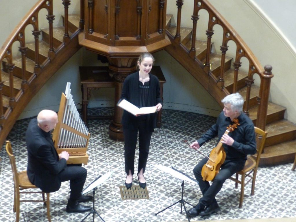 Une interprétation remarquable, grâce à la voix de soprano de Maud HAERING, magnifiquement accompagnée de la vièle à archet de Luc GAUGLER et de l’organetto d’Olivier CAMELIN.