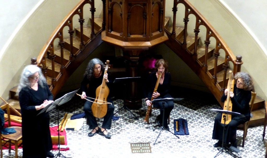 Pascale COSTANTINI (vièle, flûtes), Evelyne LUTTON (harpes), Laurence MAMAN (organetto, harpe) et Nathalie RENOUVIN (flûtes) ont décliné tout au long de la soirée diverses ambiances, divers chants mettant en valeur des situations que nous pourrions aisément qualifier « de tout temps » : Femme tour à tour mystique, abandonnée, légère, soumise, indocile ou bien heureuse… Autant de conditions que nous pouvons retrouver en tous lieux aujourd’hui encore