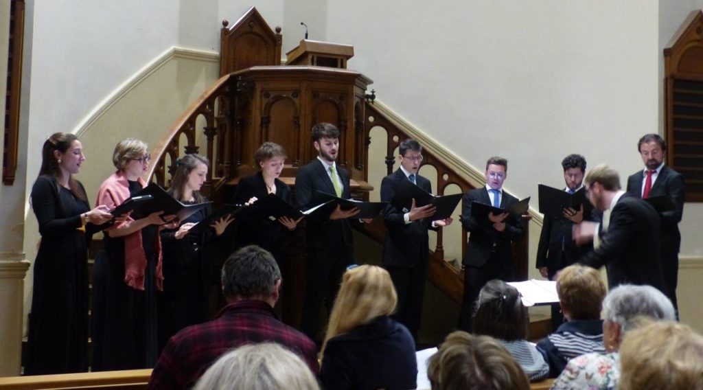 Béatrice GOBIN et Alice MARZUOLA (sopranos), Agnès BUCQUET et Ludmila KRIVICH (Altos), Romain CHAMPION et Matthias DEAU (ténors), Paul-Louis BARLET (baryton), Simon DUBOIS et Alan PICOL (Basses) ont fait résonner le Temple de ces somptueuses harmonies de musiques sacrées anglaises. Ce tout nouvel ensemble (premier concert en mars 2023) s’est spécialisé, entre autres, dans les polyphonies vocales des XVe et XVIe siècles.